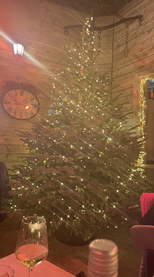 Step through the door of the converted barn into a cosy rustic haven. Outsized artisan paintings by the talented local artist, Alex Newman, grace the cabin style walls. Seating is a mix of bistro and spacious banquettes, all of which come with sheepskin throws and fleece blankets, perfect for nestling into. Wood fired burners emit a welcoming glow, and a huge real fir tree with soft fairy lights completes the Winter Wonderland mood.