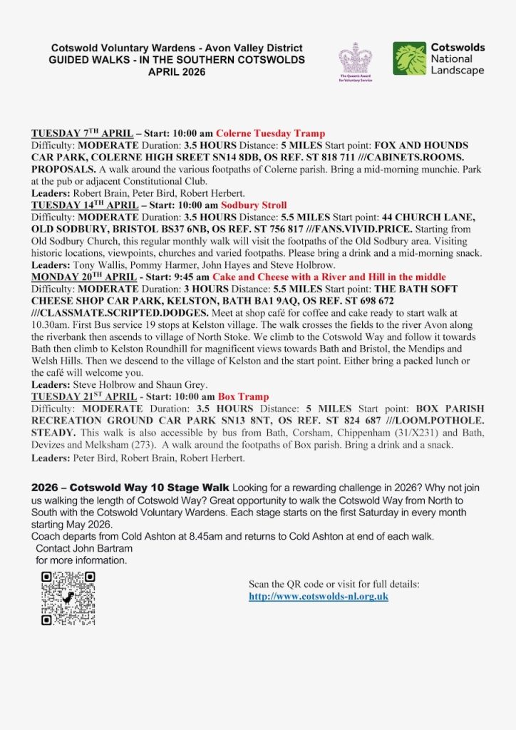 The Cotswold Voluntary Wardens offer free guided walks year round across the Cotswolds National Landscape. These walks are an interesting and sociable way of exploring the scenic Cotswold countryside and landscape. Click on the link below Read more
